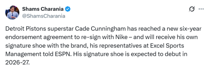 坎宁安是目前现役球员中第六位拥有耐克专属签名球鞋代言合约的球员,另外五位是詹姆斯、莫兰特、杜兰特、布克和字母哥。