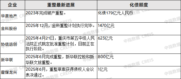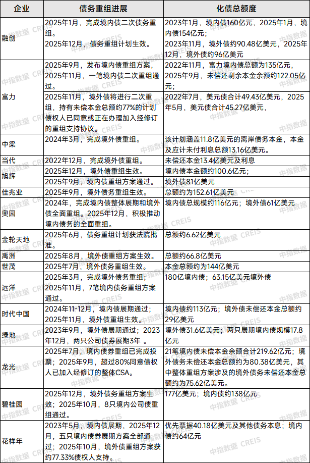 据不完全统计,截至2025年末,完成境内及境外债重组的企业有融创、旭辉、远洋、时代中国、龙光、碧桂园等。完成境外债重组企业有中梁、当代、禹洲、佳兆业、世茂等。近几年,已经有华晨地产、新华联和金科完成重整。霍煤龙兴房地产公司和协信远创进行重整,已经获得法院批准,目前在执行阶段。